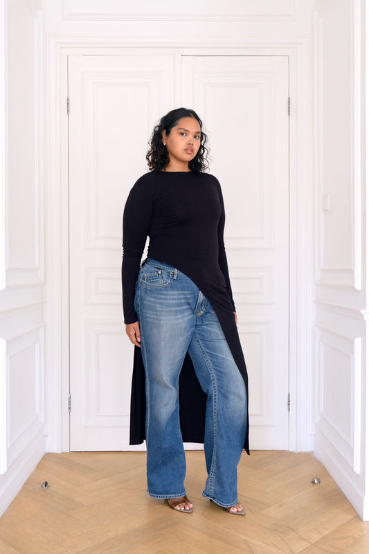 ORIA Short-Sleeve Asymmetrical Long Top in Black