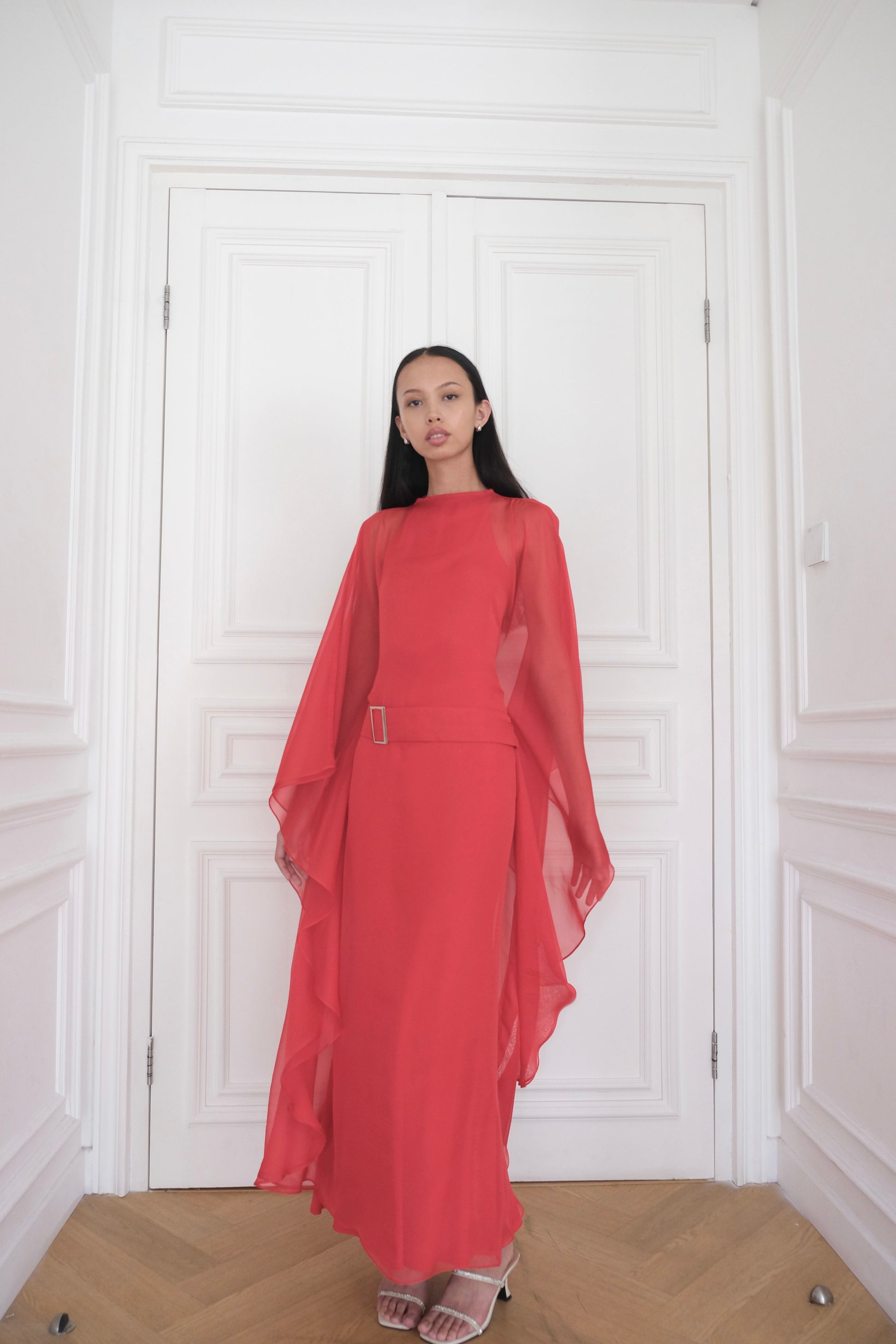 A poppy red kaftan in buttery-flowy fabric with an adjustable belt, designed to drape beautifully over the body. Comes with a matching inner dress in your choice of sleeveless boat neck or long sleeve, for versatile styling. Perfect for effortless elegance.