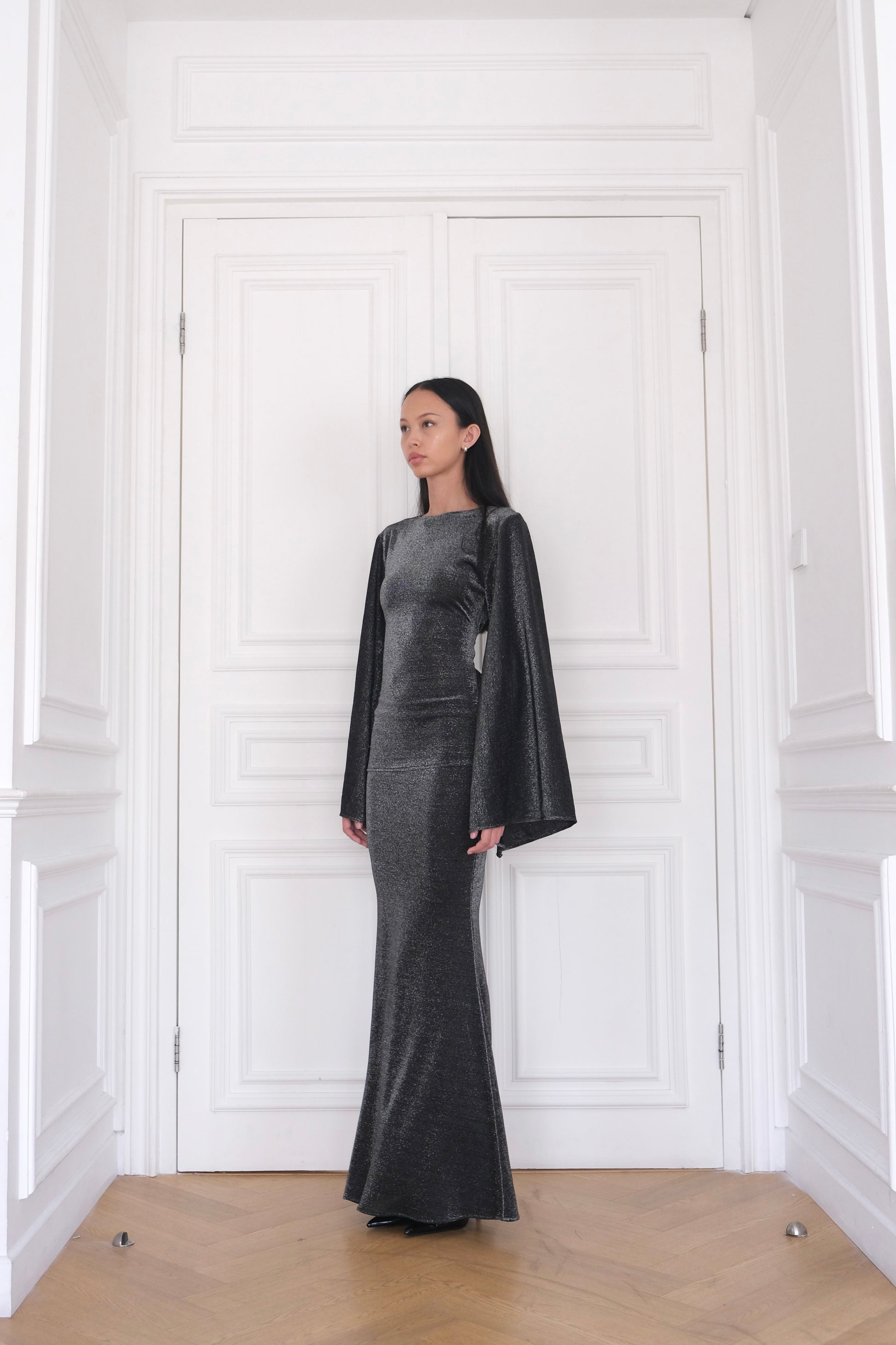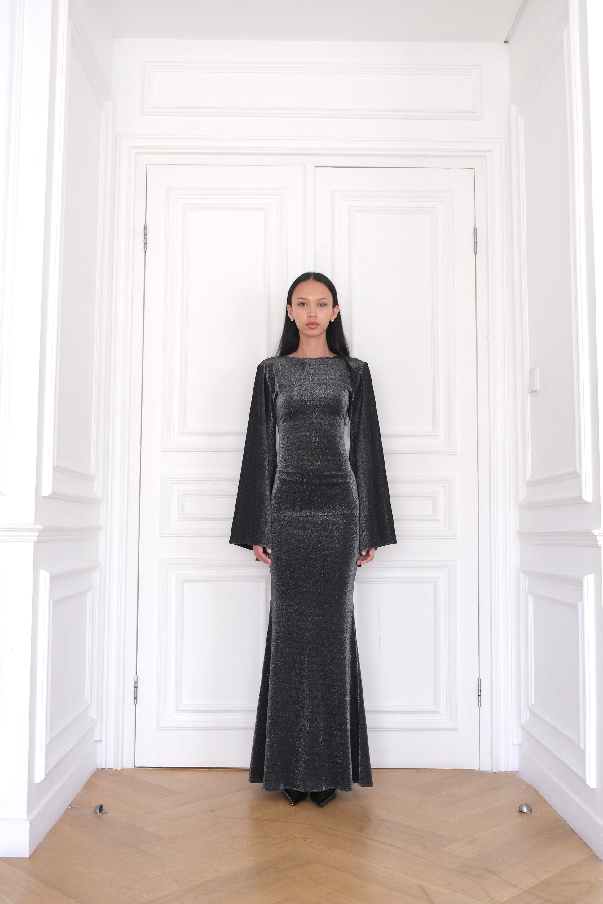 A shimmery black two-piece coordinated set features tie details at the back to create a sculpted shape that can be attached or left unattached for a loose-fitting look. From the signature silhouette of our popular Toffee Set. The top features slits on the inner side of the sleeves.
