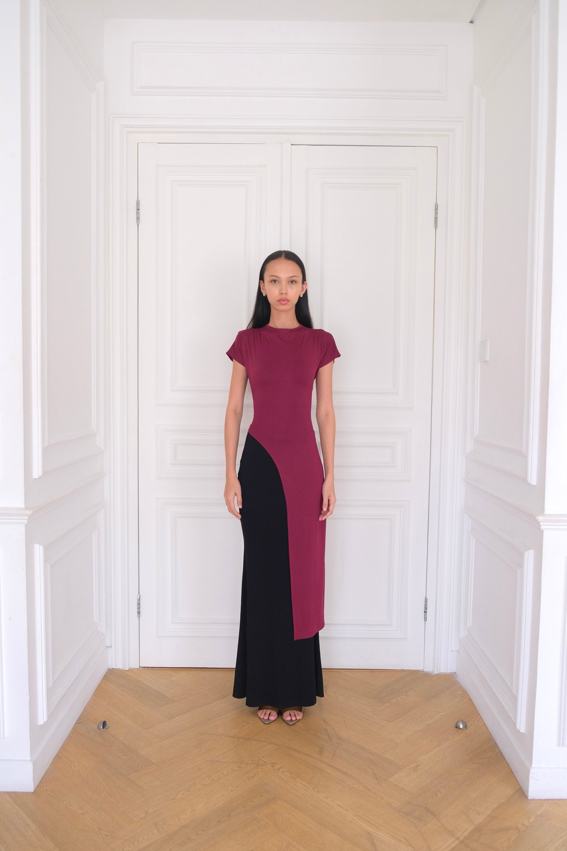 A sleek, short-sleeve longline top in burgundy, with an asymmetrical cut and adjustable back ties for a customizable fit. Made with breathable, cooling stretch fabric.