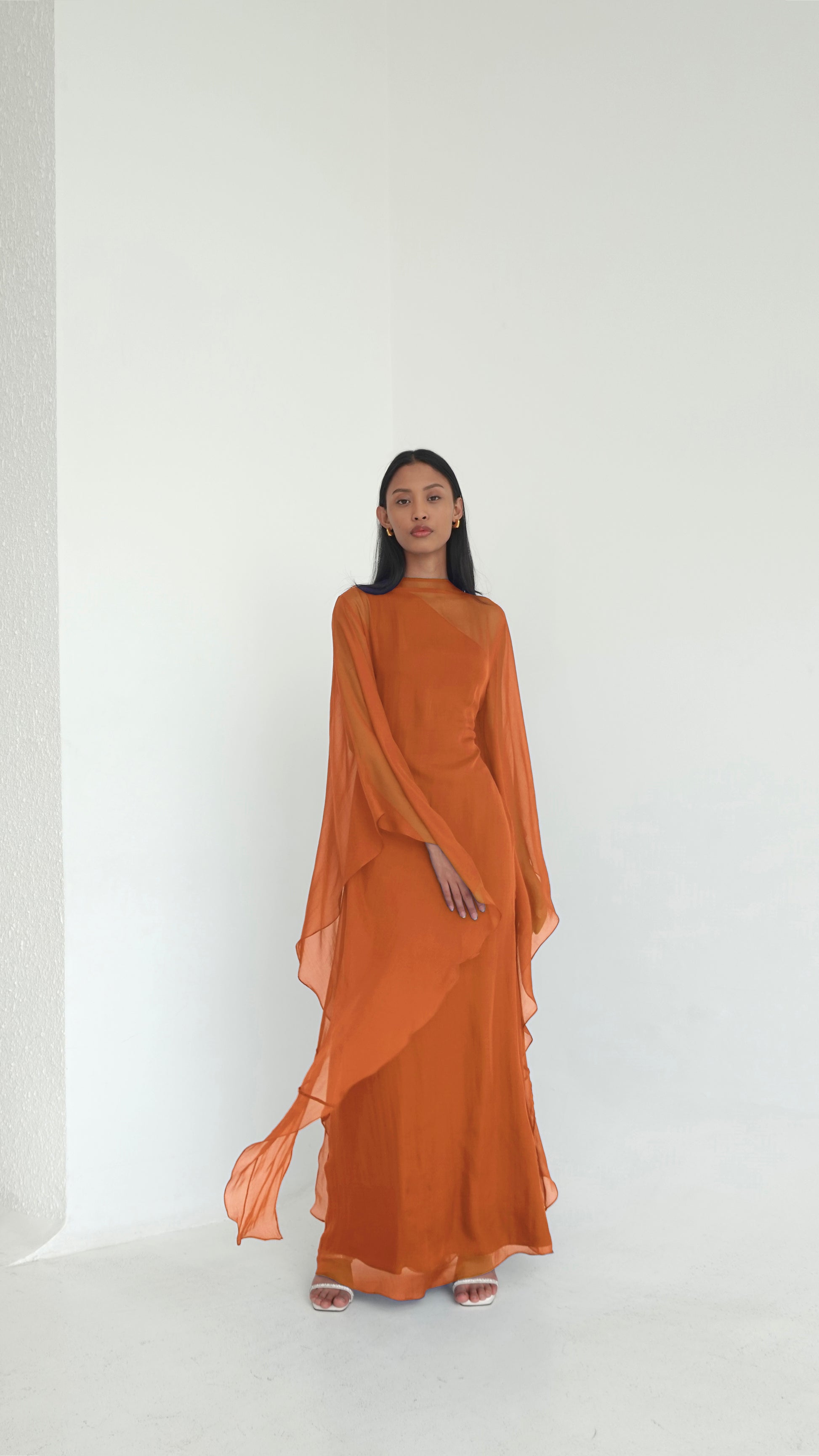 Made from 100% silk, this orange long gown blends understated luxury with effortless elegance. Comes with your choice of a one-shoulder inner or a long sleeve inner.