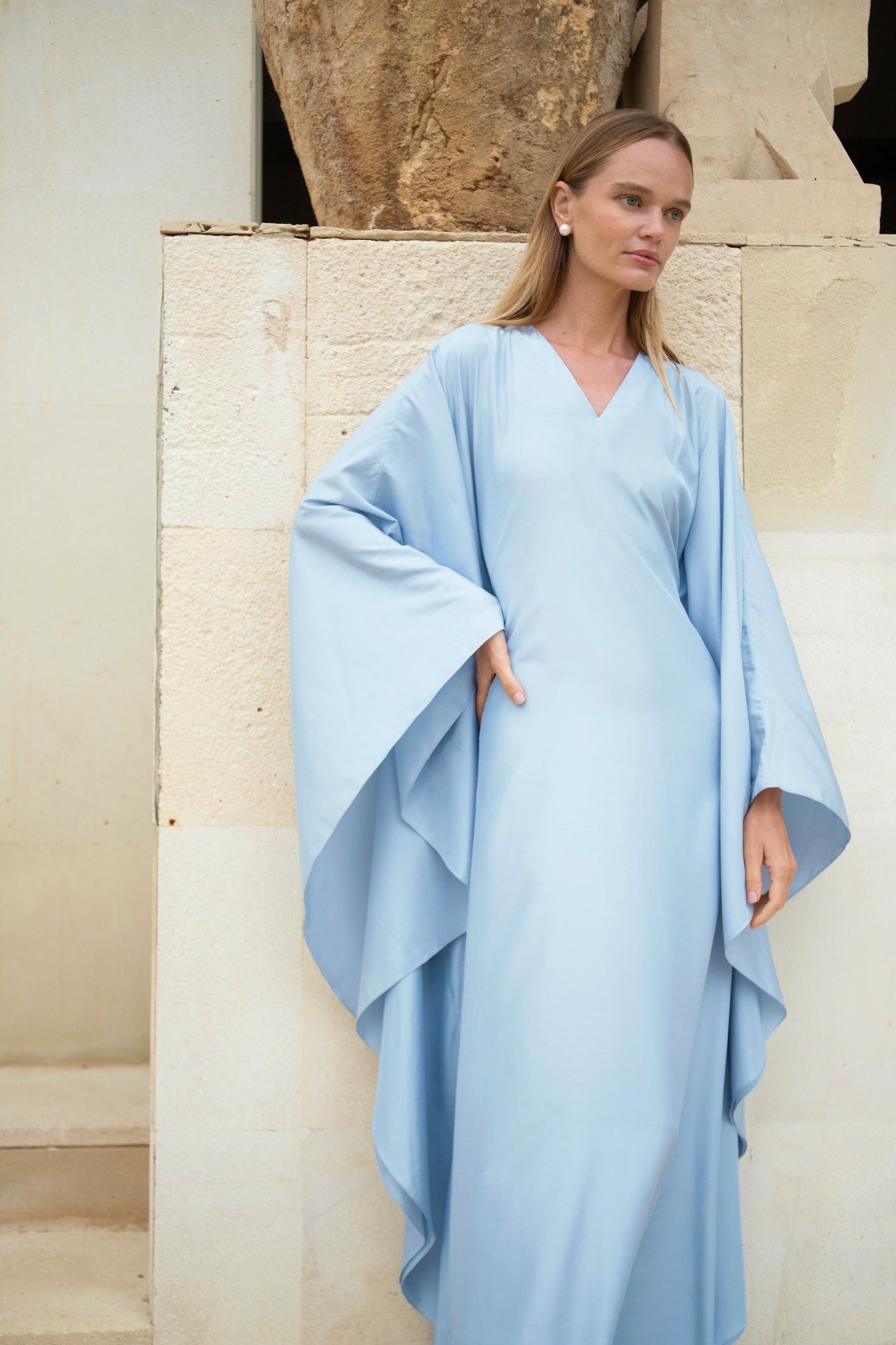 Silk Kaftan Dress in Azure V-neck | preorder ships Dec 1-20