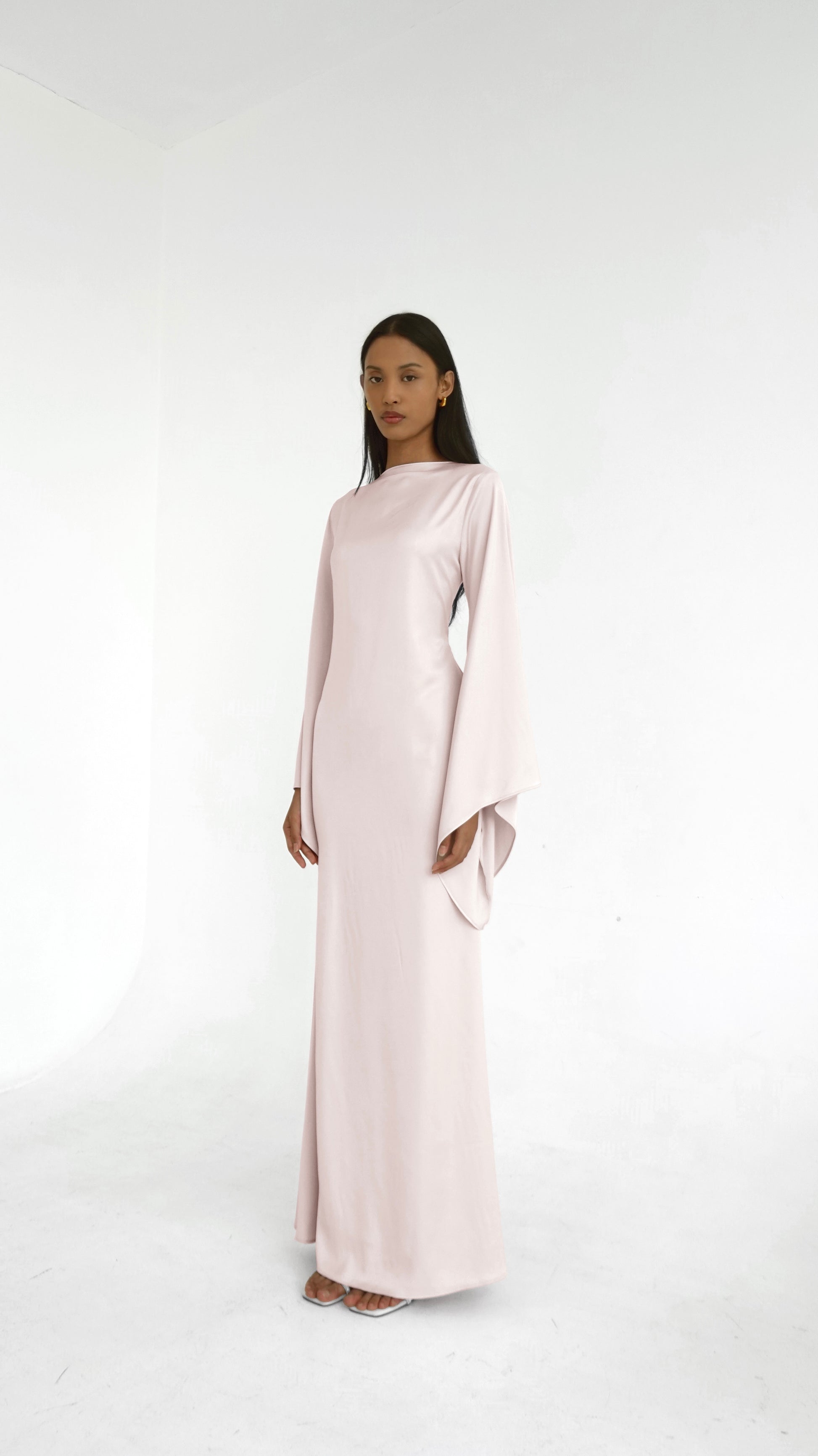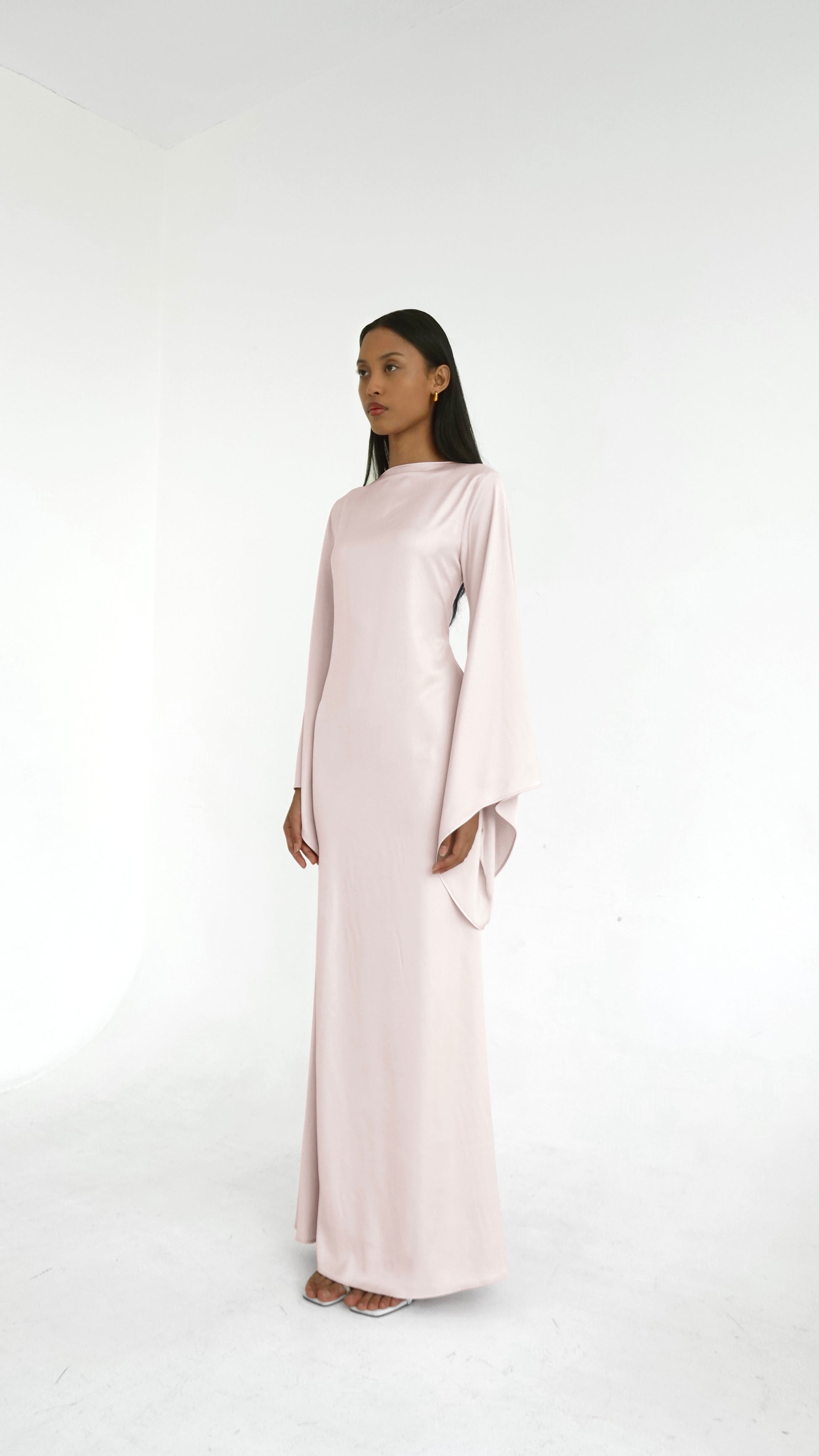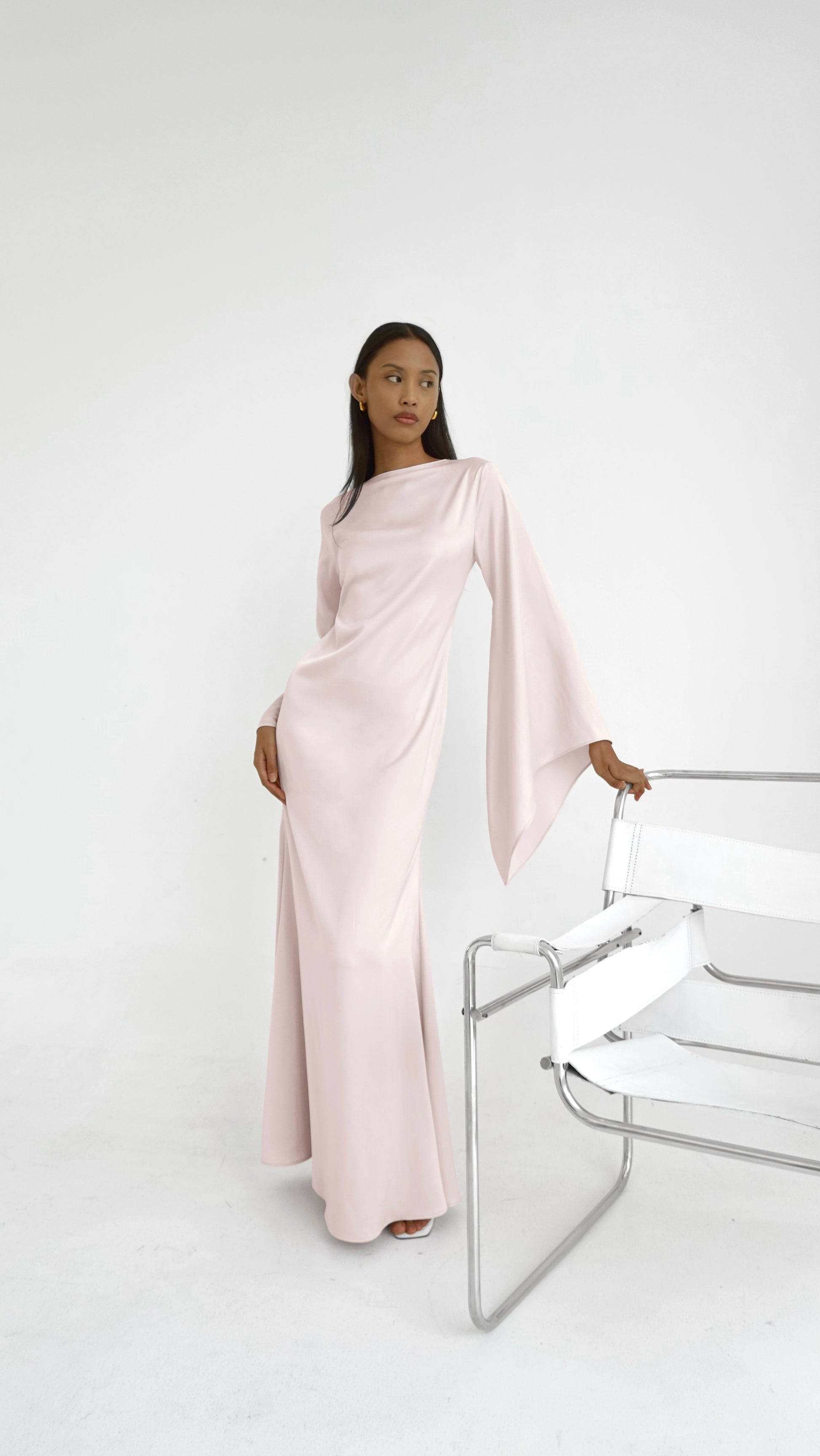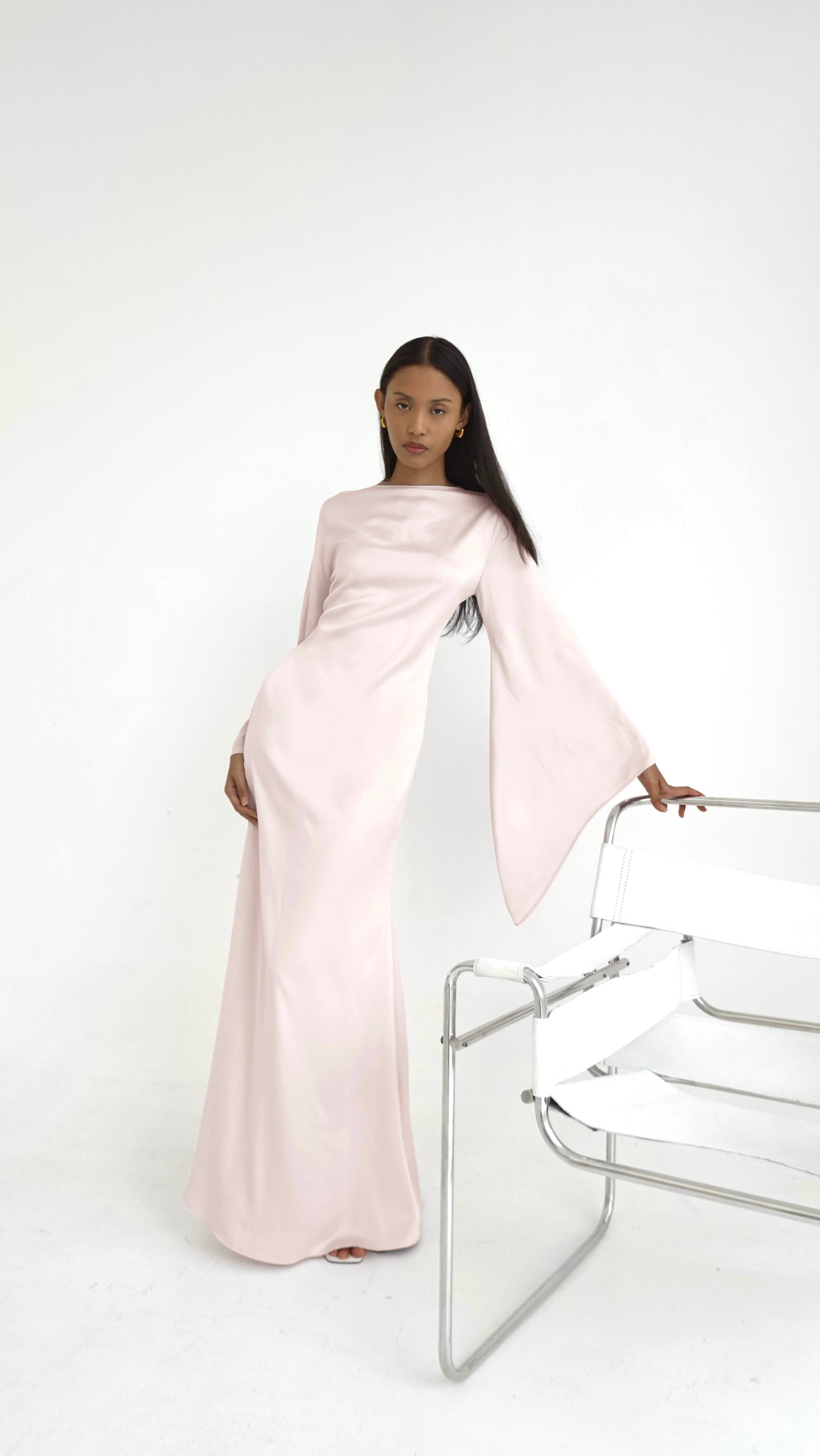 A timeless mermaid-line pink dress with elegant flare bell sleeves and a fabric that drapes beautifully, perfect for special occasions.