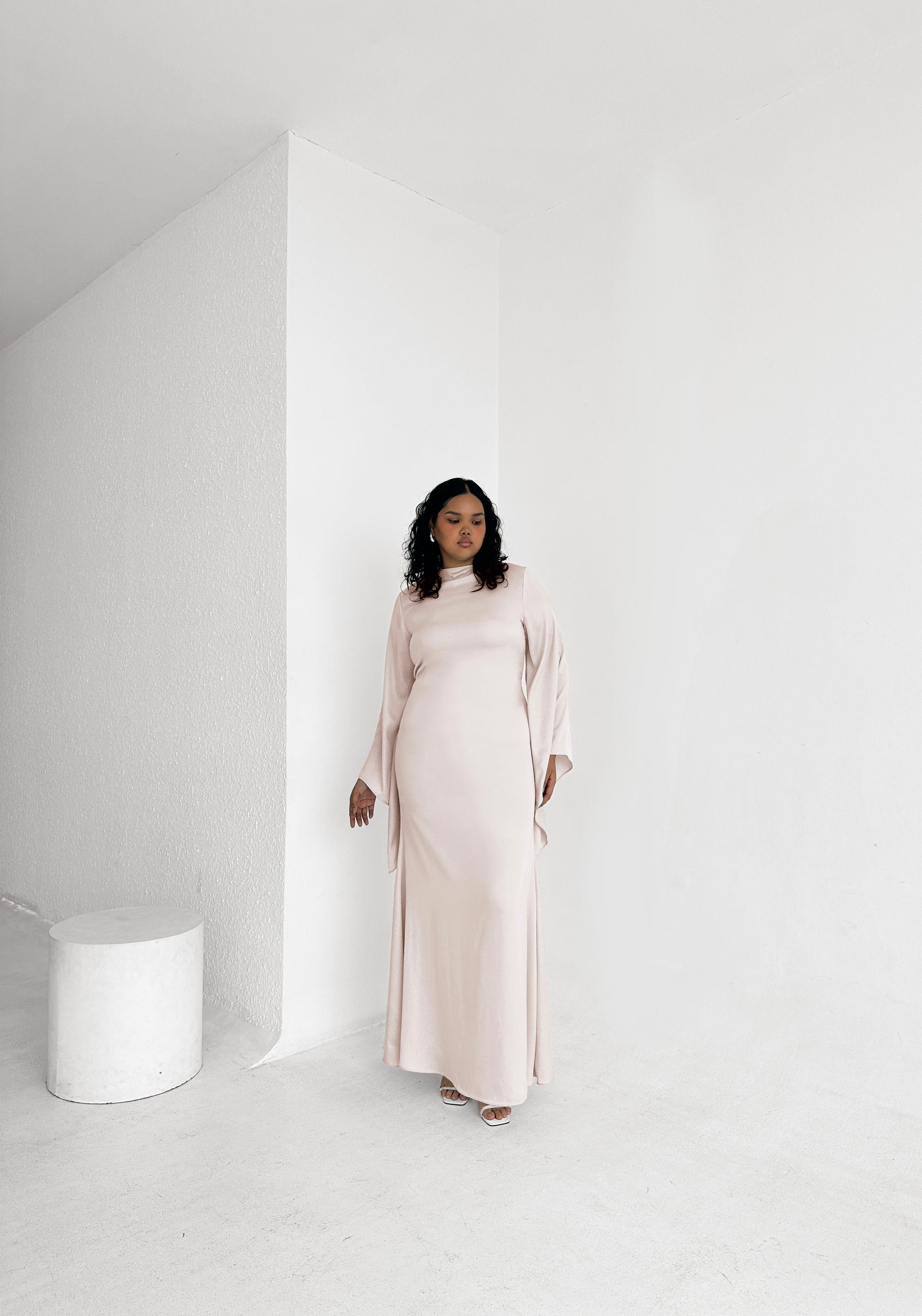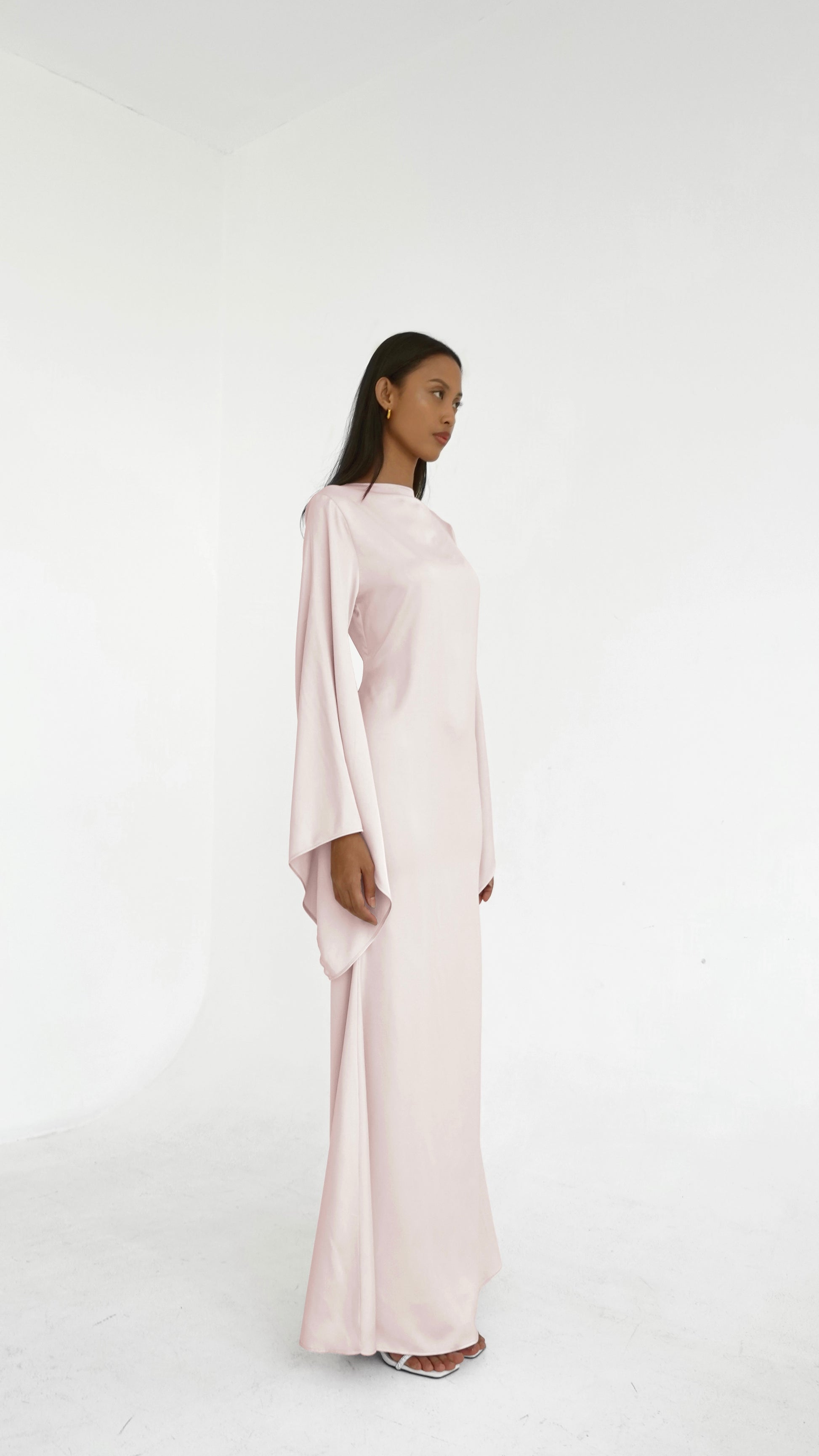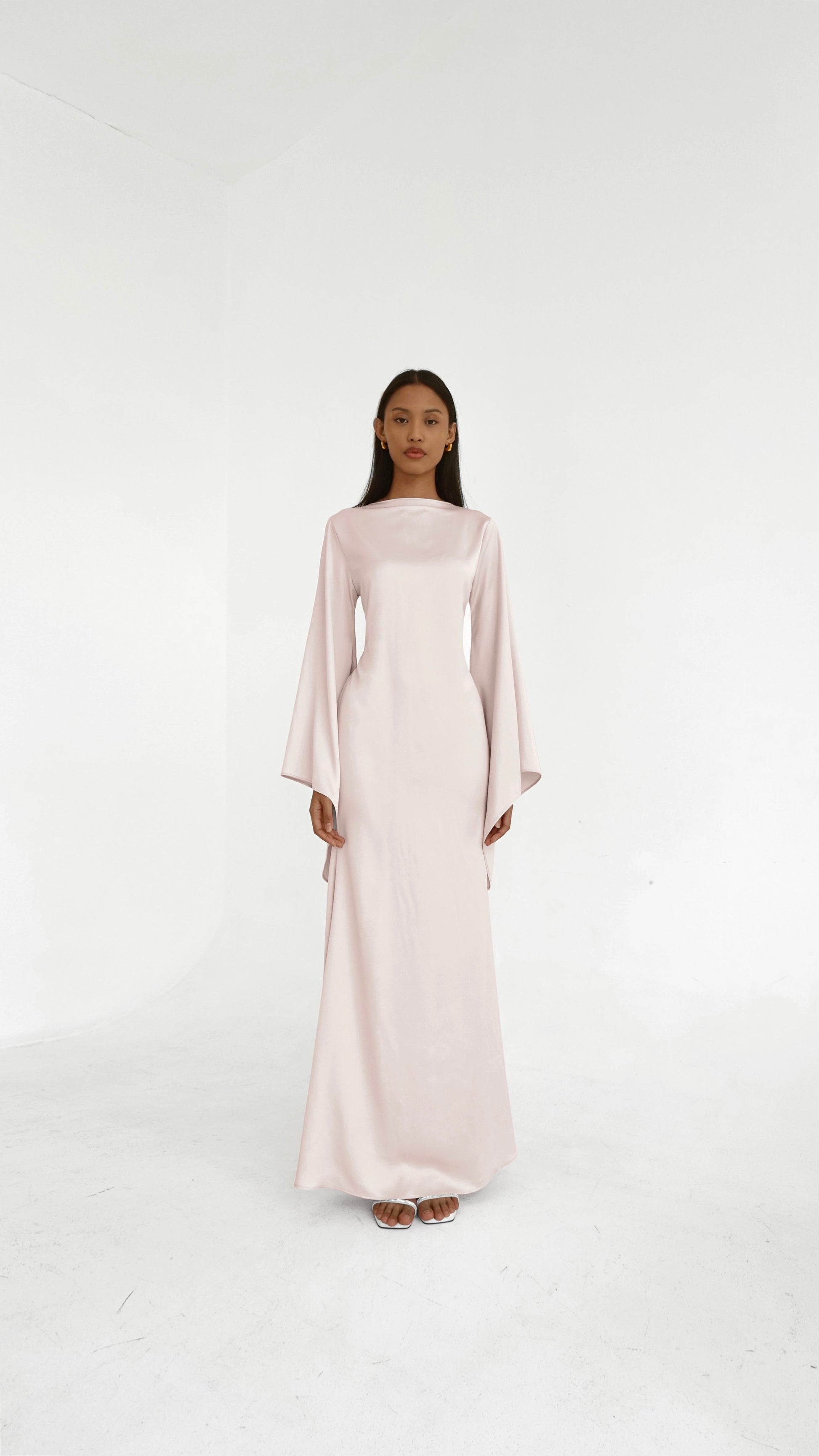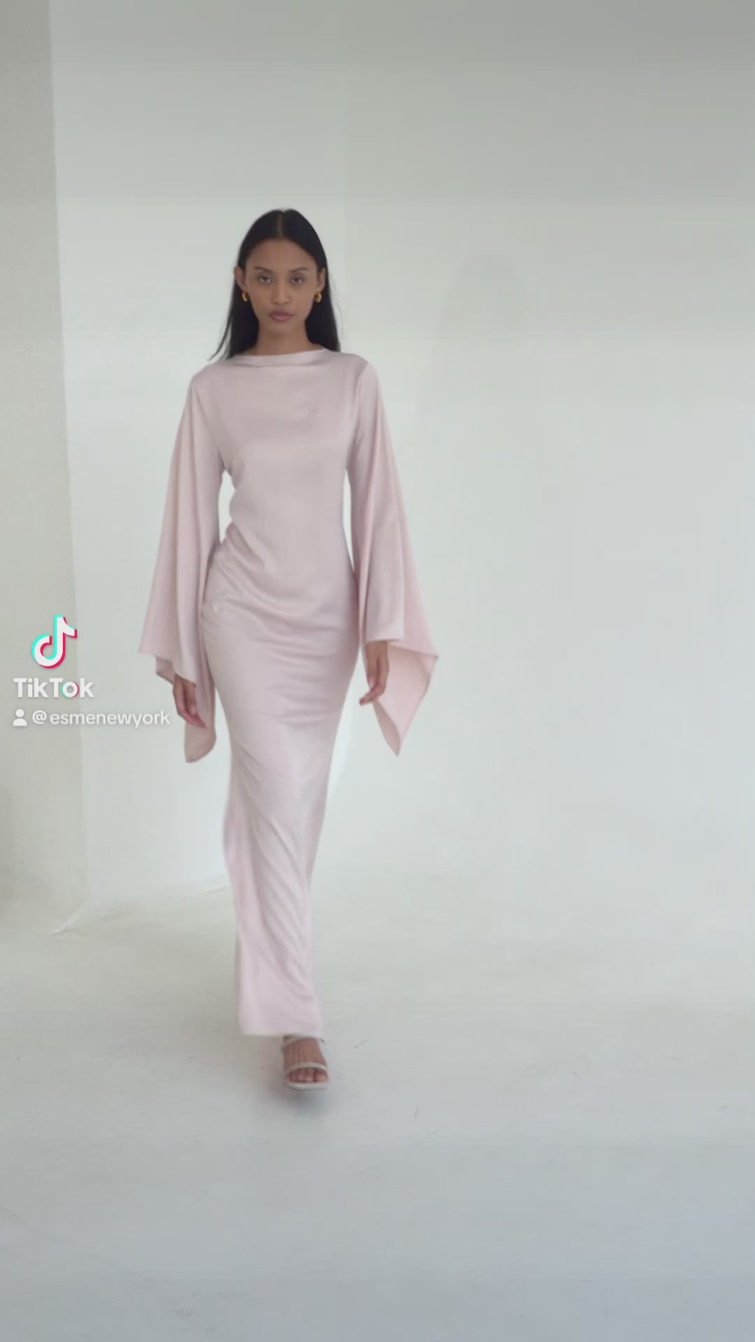 A timeless mermaid-line pink dress with elegant flare bell sleeves and a fabric that drapes beautifully, perfect for special occasions.